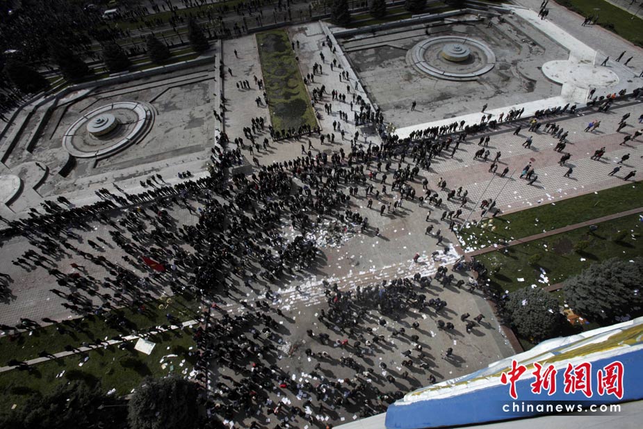 吉爾吉斯斯坦7日發(fā)生大規(guī)模騷亂,反對(duì)派示威者占領(lǐng)了議會(huì)大樓,8日,總統(tǒng)府也被示威者占領(lǐng)。圖為示威者聚集在總統(tǒng)府門(mén)前。