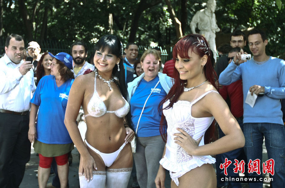 4月8日,巴西模特身著內(nèi)衣在圣保羅大街走秀,宣傳第16屆巴西情趣用品博覽會(huì)。圖片來源:中國(guó)新聞網(wǎng)