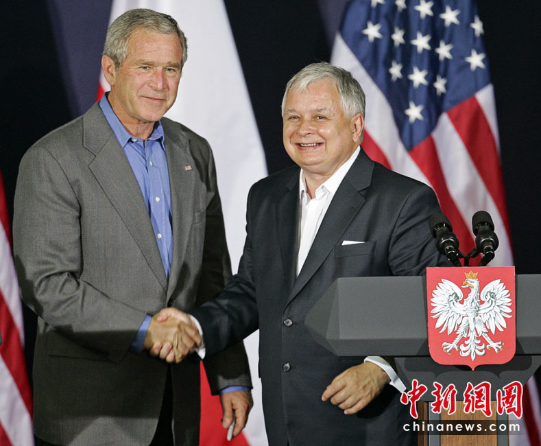波蘭總統(tǒng)卡欽斯基乘坐的一架圖-154飛機10日在俄羅斯斯摩棱斯克州北部一軍用機場降落時失事,至少87人死亡?J斯基本人被確認身亡。圖為2007年波蘭總統(tǒng)卡欽斯基與美國前總統(tǒng)小布什。