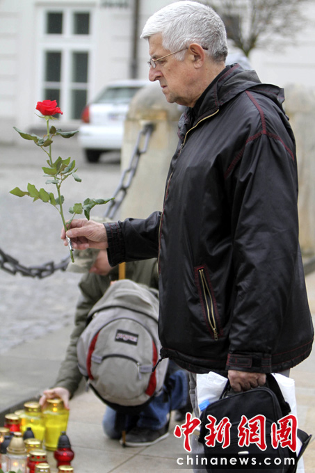 圖為波蘭華沙總統(tǒng)府前,有民眾拿著鮮花悼念身亡的總統(tǒng)。波蘭總統(tǒng)卡欽斯基乘坐的飛機10日在俄斯摩棱斯克失事,波蘭總統(tǒng)卡欽斯基已經(jīng)確認死亡。有報道稱,飛機可能是在降落時被樹剮到,沒能在跑道上落地而墜落。不過亦有俄羅斯安全部門消息人士稱,人為失誤可能是造成波蘭總統(tǒng)專機墜毀的最主要原因。