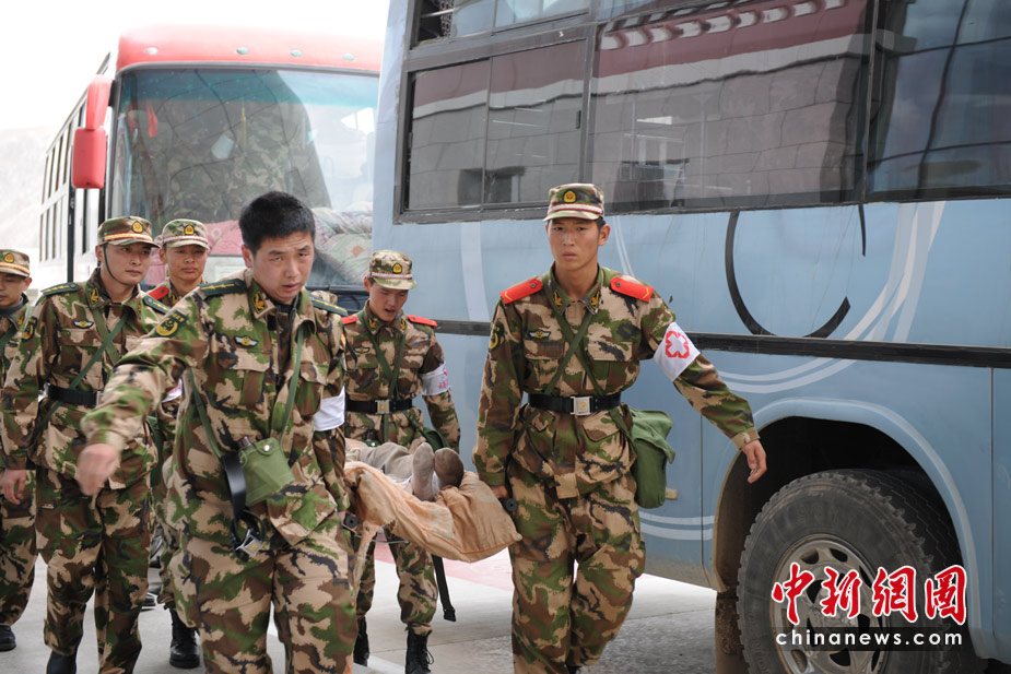 4月15日,玉樹地震傷員正源源不斷的從玉樹機(jī)場乘飛機(jī),被運往成都等地救治。 中新社/中新網(wǎng)記者 符永康 攝