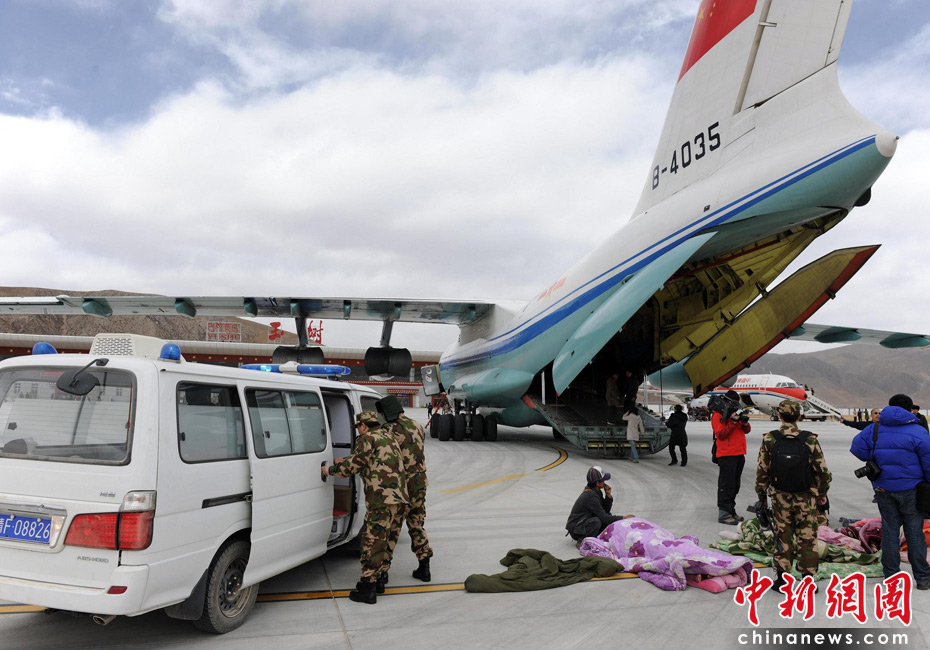 15日下午3時許,空軍動用一架伊爾-76運輸機(jī)在玉樹機(jī)場起運30多位震災(zāi)傷員,就近飛往成都市進(jìn)行救治。中新社發(fā) 符永康 攝