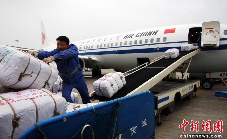 4月15日,重慶江北國際機(jī)場停機(jī)坪上,工人們緊張地將救援物資裝運(yùn)上飛機(jī)準(zhǔn)備起運(yùn)青海地震災(zāi)區(qū)。青海玉樹縣地震發(fā)生后,中共中央政治局委員、重慶市委書記薄熙來庚即作出重要批示,要求重慶全力以赴支援災(zāi)區(qū),根據(jù)災(zāi)區(qū)需求提供支援。中共重慶市委、市政府第一時間向青海省政府發(fā)去了慰問電,并支援災(zāi)區(qū)300萬元和大批救援物資,首批救援物資于當(dāng)日下去從重慶起飛空運(yùn)至災(zāi)區(qū)。中新社發(fā) 郭晉嘉 攝
