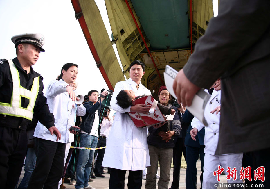 一架載有青海玉樹地震首批傷員及傷員家屬的中國空軍運(yùn)輸機(jī)抵達(dá)成都雙流國際機(jī)場,其中35名地震傷員將被分別送往四川省人民醫(yī)院和四川大學(xué)華西醫(yī)院進(jìn)行治療,運(yùn)輸機(jī)于15日下午15時(shí)30分從玉樹當(dāng)?shù)貦C(jī)場起飛,經(jīng)過1小時(shí)30分的飛行,歷程800公里,于4月15日下午17時(shí)03分,順利抵達(dá)成都。圖為醫(yī)院搶救人員正將受傷小孩從飛機(jī)抱往救護(hù)車。中新社發(fā) 張浪 攝