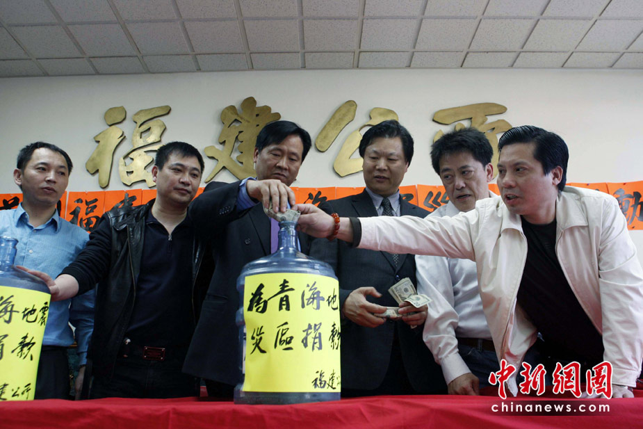 青海玉樹(shù)發(fā)生地震以來(lái),美國(guó)各地的華人華僑齊伸援手,紐約的華人社團(tuán)聯(lián)合總會(huì)15日呼吁下屬數(shù)百社團(tuán)為玉樹(shù)災(zāi)區(qū)捐款,并在華埠主要街道沿街設(shè)立捐款箱。圖為紐約福建公所捐款現(xiàn)場(chǎng),華人華僑們?cè)诓坏綆追昼姷臅r(shí)間內(nèi),就為青海玉樹(shù)災(zāi)區(qū)捐款近5000美元。中新社發(fā) 魏晞 攝