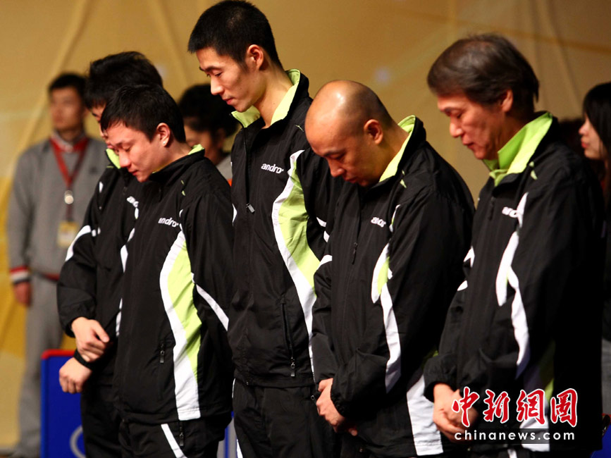 4月15日,亞歐乒乓球全明星對(duì)抗賽在北京進(jìn)行第二天的爭(zhēng)奪。賽前,現(xiàn)場(chǎng)所有球員和觀眾為青海玉樹地震災(zāi)區(qū)的遇難同胞默哀一分鐘,組委會(huì)宣布將把本次賽事的全部票房收入捐贈(zèng)地震災(zāi)區(qū)。中新社發(fā) 富田 攝