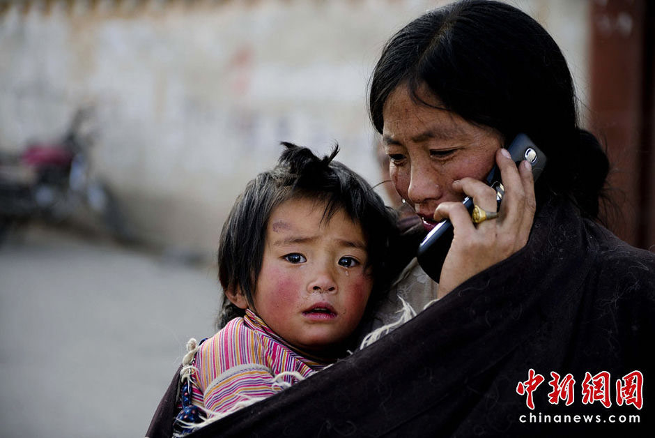 圖為4月15日,青海玉樹縣體育場的地震災(zāi)民安置點內(nèi),一位抱著小女兒的母親在與親人通話時潸然淚下。中新社發(fā) 廖攀 攝