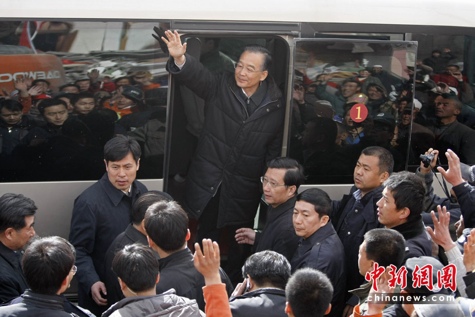 2010年4月16日,中國國務(wù)院總理溫家寶在青海省玉樹藏族自治州玉樹縣地震災(zāi)區(qū)視察救援現(xiàn)場。4月14日07時49分許,青海省玉樹藏族自治州玉樹縣(北緯33.1,東經(jīng)96.7)發(fā)生7.1級地震。中新社發(fā) 盛佳鵬 攝