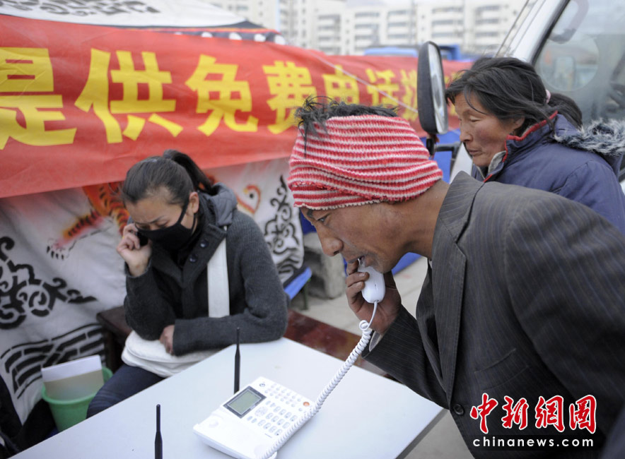 4月16日,青海玉樹體育場地震受災民眾安置點,民眾撥打有關部門安裝的免費電話報平安。 中新社發(fā) 廖攀 攝