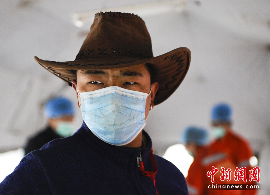 4月16日,青海玉樹(shù)體育場(chǎng)武警醫(yī)院醫(yī)療隊(duì)帳篷里,一名戴著紅絲帶的志愿者幫助醫(yī)務(wù)人員展開(kāi)救援。 中新社發(fā) 廖攀 攝