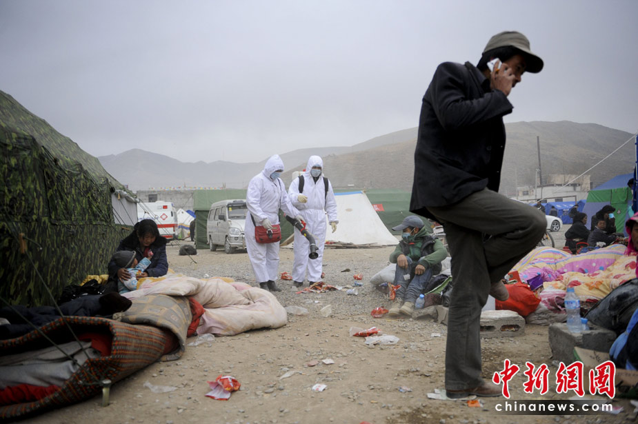 4月16日,青海玉樹體育場地震災民安置點,青海疾控中心展開防疫消毒工作。中新社發(fā) 廖攀 攝