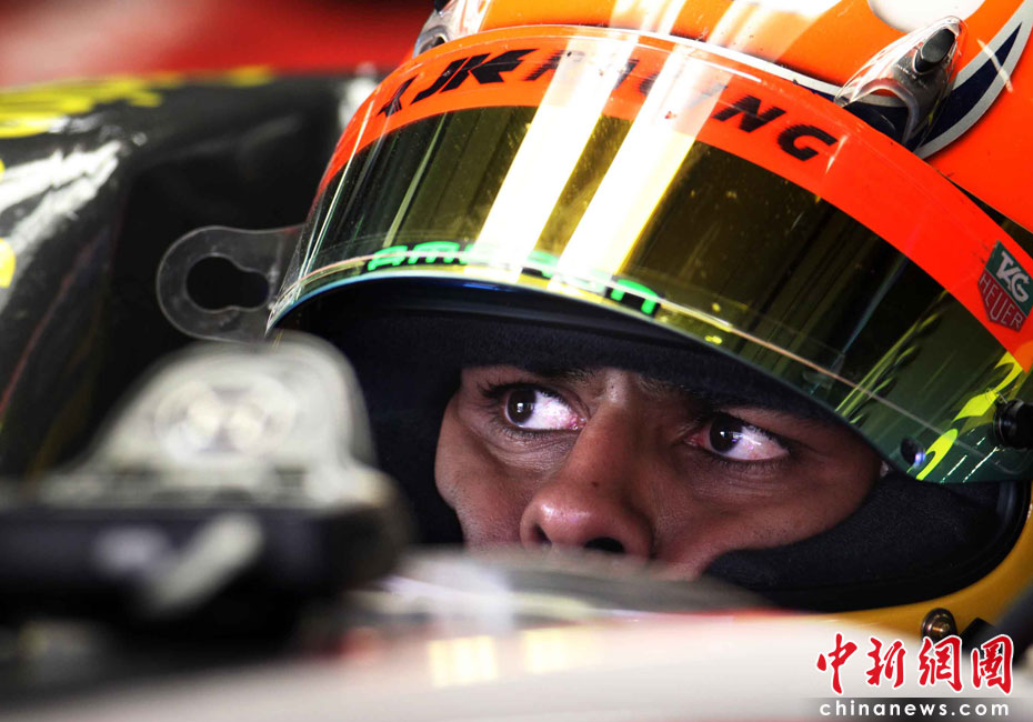 4月16日,2010國際汽聯(lián)F1世界錦標(biāo)賽上海站在上海國際賽車場開始車手第一、第二次練習(xí)賽。圖為代表印度車隊出戰(zhàn)的印度車手查鐸。中新社記者 任晨鳴 攝