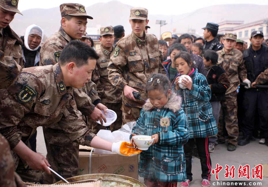 4月16日,青海省玉樹藏族自治州玉樹縣地震發(fā)生第三天,為確保災(zāi)民有飯吃、有帳篷住,玉樹城內(nèi)各個安置點架起鍋灶為受災(zāi)民眾分發(fā)免費食物并幫助搭建帳篷。4月14日07時49分許,青海省玉樹藏族自治州玉樹縣(北緯33.1,東經(jīng)96.7)發(fā)生7.1級地震。中新社發(fā) 劉忠俊 攝