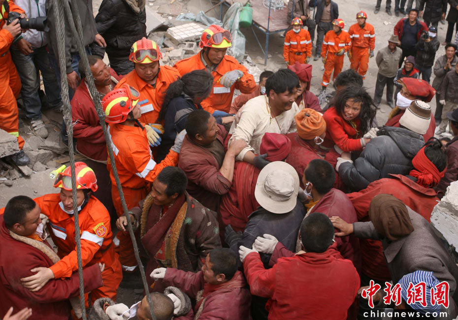 2010年4月16日13:50分左右,青海省玉樹藏族自治州玉樹縣地震發(fā)生第三天,在中心城區(qū)一垮塌賓館現(xiàn)場一名被埋54小時13歲的才珍拉姆被國家地震局應(yīng)急救援隊等成功救出。4月14日07時49分許,青海省玉樹藏族自治州玉樹縣(北緯33.1,東經(jīng)96.7)發(fā)生7.1級地震。中新社發(fā) 劉忠俊 攝