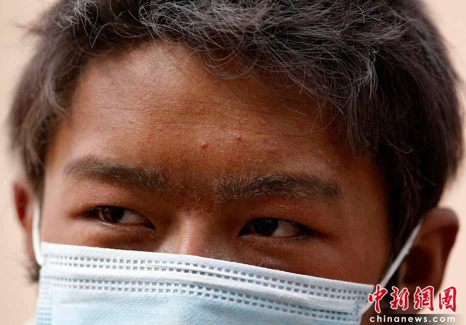 2010年4月16日,青海玉樹藏族自治州玉樹縣結古鎮(zhèn)一所中學的震災救援現(xiàn)場,救援人員的頭發(fā)、眉毛都落滿塵土。中新社發(fā) 盛佳鵬 攝