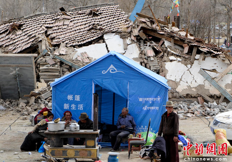 4月16日,青海玉樹衛(wèi)生職業(yè)中專的受災民眾在地震廢墟前的帳篷里生活,基本生活條件得到保障。目前38000余棉帳篷正在運往災區(qū),有超過1萬頂帳篷已經(jīng)運抵。中新社發(fā) 廖攀 攝