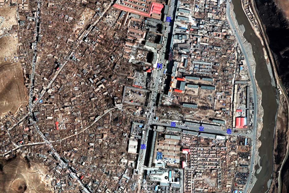 利用對(duì)地觀測(cè)中心2010年4月16日獲取的高分辨率航空遙感數(shù)據(jù),提取出玉樹(shù)州結(jié)古鎮(zhèn)城區(qū)范圍內(nèi)地震破壞最嚴(yán)重或典型地區(qū),使之與GoogleEarth中相應(yīng)位置的震前遙感衛(wèi)星數(shù)據(jù)進(jìn)行對(duì)比,直觀展現(xiàn)結(jié)古鎮(zhèn)在此次地震中的受影響程度。圖片來(lái)源:中國(guó)科學(xué)院