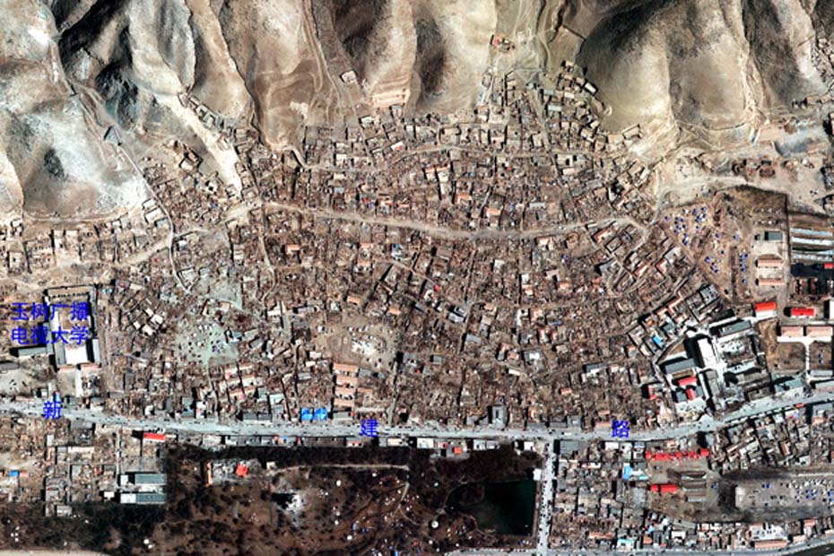 利用對地觀測中心2010年4月16日獲取的高分辨率航空遙感數(shù)據(jù),提取出玉樹州結(jié)古鎮(zhèn)城區(qū)范圍內(nèi)地震破壞最嚴重或典型地區(qū),使之與GoogleEarth中相應位置的震前遙感衛(wèi)星數(shù)據(jù)進行對比,直觀展現(xiàn)結(jié)古鎮(zhèn)在此次地震中的受影響程度。圖片來源:中國科學院