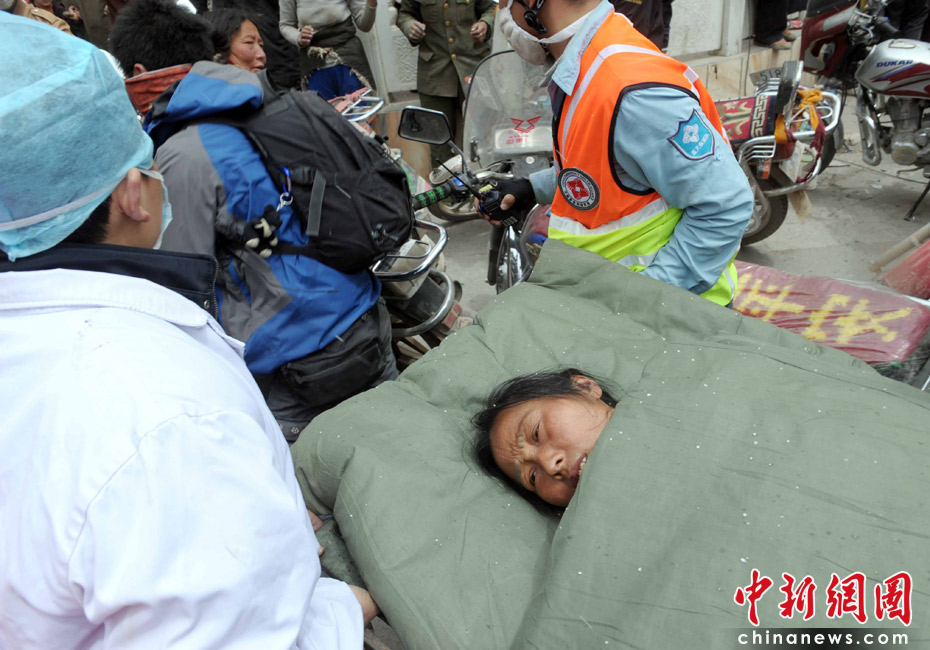 4月17日13點(diǎn)38分許,搜救隊(duì)在玉樹(shù)結(jié)古鎮(zhèn)成功救出一名中年婦女,幸存者神志清醒,還睜著眼睛,據(jù)悉腿部、腰部受傷。中新社發(fā) 陳文 攝