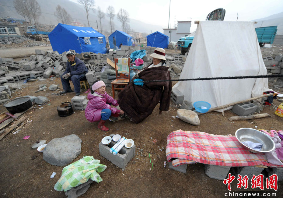 4月17日上午,青海省民政廳廳長更陽向媒體發(fā)布了一系列安撫救濟措施,災民生活補助按每人每天15元,每一個死亡人員家庭補助8000元,“三孤”指孤老、孤殘、孤兒補助每人每月1000元,孤兒補助到18歲止。圖為震區(qū)一家人和他們的全部家當。中新社發(fā) 陳文 攝