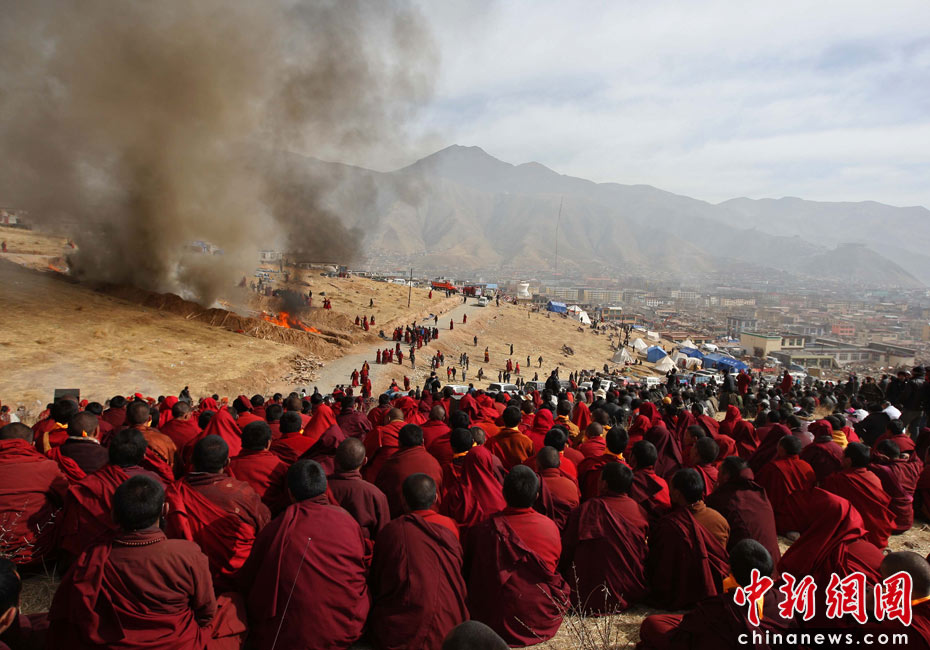 4月17日,青海省玉樹縣結(jié)古鎮(zhèn)附近的山坡上,眾多地震遇難者遺體被火葬。當(dāng)日,為妥善及時(shí)處理遇難人員遺體,預(yù)防災(zāi)區(qū)疫情的發(fā)生與流行,青海出臺(tái)地震遇難人員遺體處理意見,強(qiáng)調(diào)在處理遺體時(shí)要尊重少數(shù)民族喪葬習(xí)俗,尊重死者尊嚴(yán)。圖為眾多僧侶為逝者祈禱。中新社發(fā) 盛佳鵬 攝