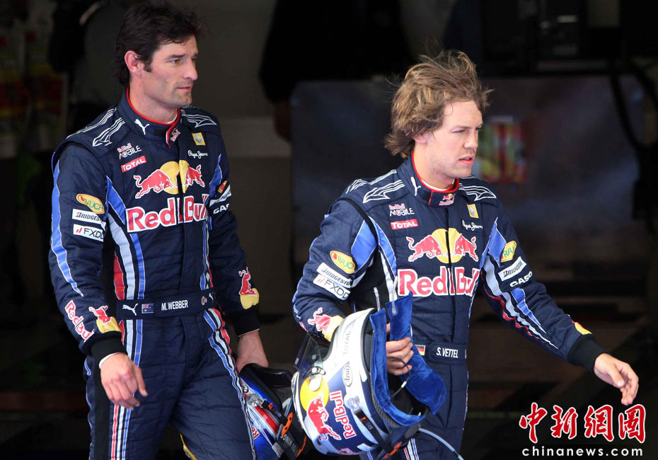 4月17日下午,2010國(guó)際汽聯(lián)F1世界錦標(biāo)賽上海站在上海國(guó)際賽車(chē)場(chǎng)舉行排位賽,代表紅牛車(chē)隊(duì)出戰(zhàn)的德國(guó)車(chē)手維特爾(右)獲得桿位,隊(duì)友、澳大利亞車(chē)手韋伯獲得第二名,法拉利車(chē)隊(duì)的西班牙車(chē)手阿隆索獲得第三名。中新社記者 任晨鳴 攝