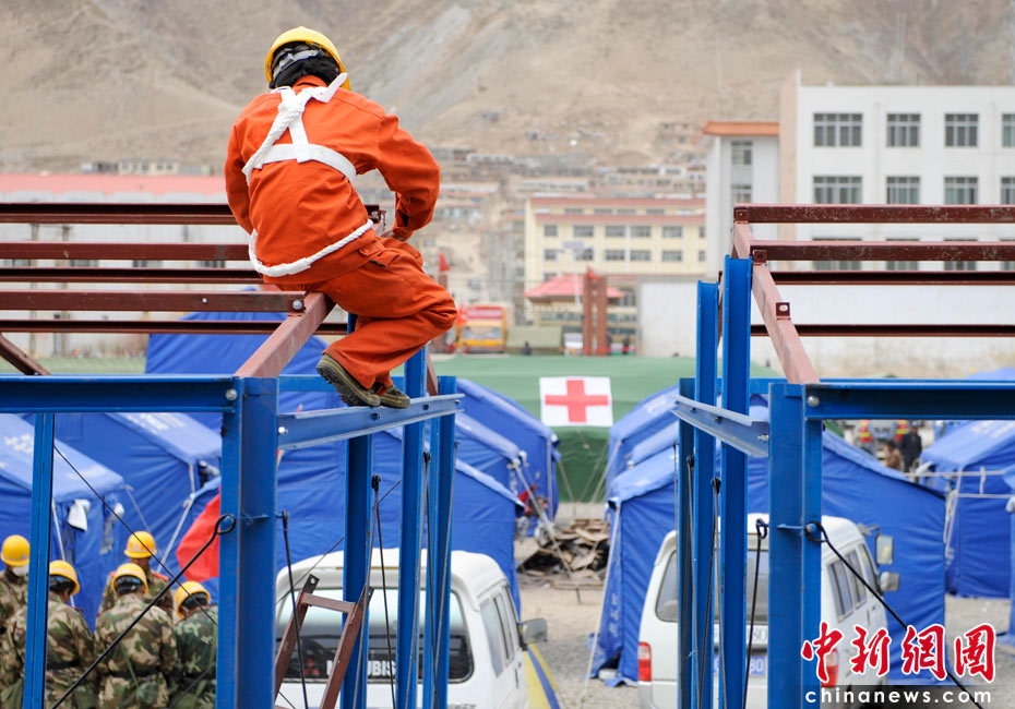 4月17日,青海玉樹體育場(chǎng)受災(zāi)民眾安置點(diǎn),工人們安裝臨時(shí)板房。中新社發(fā) 廖攀 攝