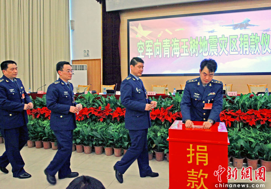 4月17日,中國空軍啟動“空軍向青海玉樹地震災區(qū)捐款儀式”,號召全空軍廣大官兵向災區(qū)人民捐款。在當天的捐款儀式上即捐款13萬多元。這些捐款將在空軍向玉樹捐款活動結束后,統(tǒng)一送往災區(qū)。中新社發(fā) 譚超 攝