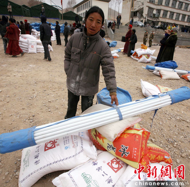 4月17日,大批救災(zāi)物資抵達(dá)青海省玉樹(shù)地震災(zāi)區(qū),當(dāng)?shù)卣皶r(shí)組織將救災(zāi)帳篷和糧食分發(fā)到災(zāi)民手中。圖為玉樹(shù)清水河鄉(xiāng)的受災(zāi)民眾領(lǐng)到全家的救災(zāi)物資糧食和帳篷。中新社發(fā) 劉忠俊 攝
