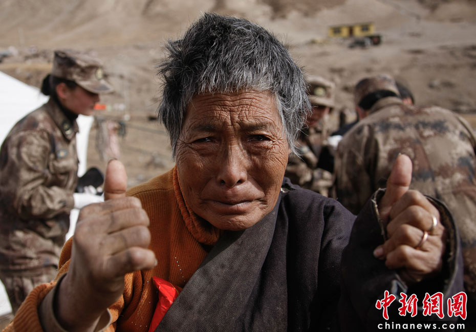 4月18日,總后青藏兵站部抗震醫(yī)療隊在青海玉樹震中結(jié)古鎮(zhèn)展開救援的同時,還派員向周邊牧區(qū)巡診,救治傷病員。圖為黃林格頭牧區(qū)78歲的旦樣老阿媽熱淚盈眶地向醫(yī)務(wù)人員豎起大了拇指。中新社發(fā) 鄒小慶 攝
