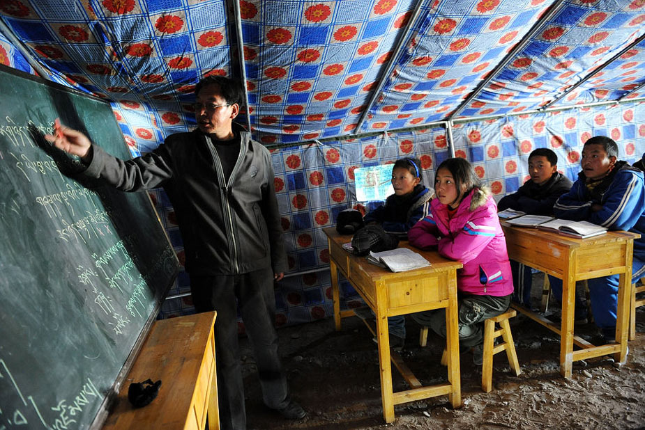 4月18日,70多名孩子在地震四天后重新走進(jìn)了課堂,玉樹州孤兒學(xué)校成為了地震災(zāi)區(qū)第一所復(fù)課的學(xué)校,剛完成帳篷搭建的青海省玉樹藏族自治州第一民族中學(xué)3個(gè)年級的學(xué)生也開始復(fù)課。圖為4月18日,玉樹藏族自治州第一民族中學(xué)八年級老師次成尼瑪(左一)在帳篷教室內(nèi)給學(xué)生上課。 圖片來源:新華網(wǎng)