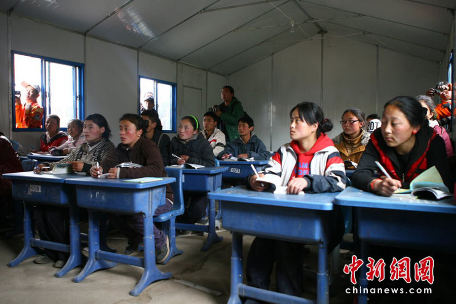4月18日,70多名孩子在地震四天后重新走進(jìn)了課堂,玉樹州孤兒學(xué)校成為了地震災(zāi)區(qū)第一所復(fù)課的學(xué)校,剛完成帳篷搭建的青海省玉樹藏族自治州第一民族中學(xué)3個(gè)年級的學(xué)生也開始復(fù)課。青友 攝