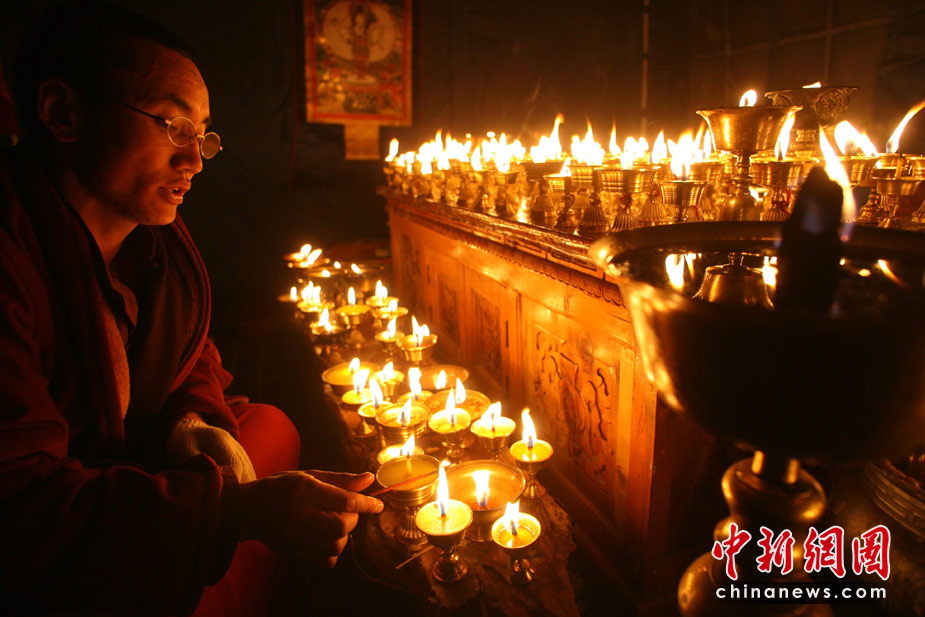 4月18日晚,玉樹僧人為地震遇難者供燈。當(dāng)日,民眾自發(fā)在結(jié)古鎮(zhèn)格薩爾王廣場舉行酥油燈法會,悼念地震遇難者。中新社發(fā) 蘇丹 攝