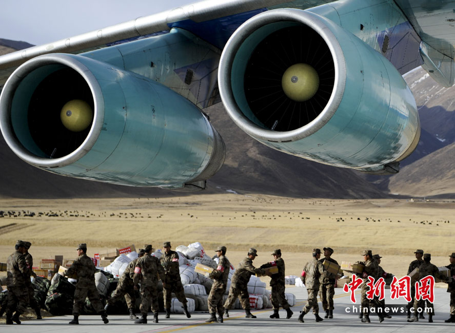 4月19日,玉樹機(jī)場(chǎng),士兵們正從空軍飛機(jī)上卸載物資。據(jù)統(tǒng)計(jì),截至18日,空軍已出動(dòng)8架大型運(yùn)輸機(jī),飛行152架次,運(yùn)送救援人員2950人、傷員1640人、物資930噸。中新社發(fā) 廖攀 攝