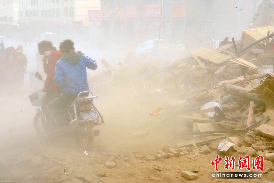 4月中旬青海玉樹地震災(zāi)區(qū)風(fēng)沙迷漫,結(jié)古鎮(zhèn)受災(zāi)民眾在風(fēng)塵滾滾中艱難出行。中新社發(fā) 賈國榮 攝