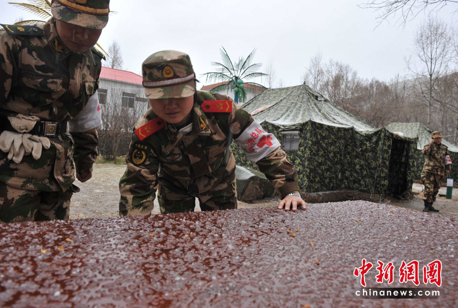 4月20日12時許,玉樹地震災區(qū)突然雷雹交加,給青海武警總隊醫(yī)療救護隊治療抗震救災傷員造成困難。中新社發(fā) 賈國榮 攝