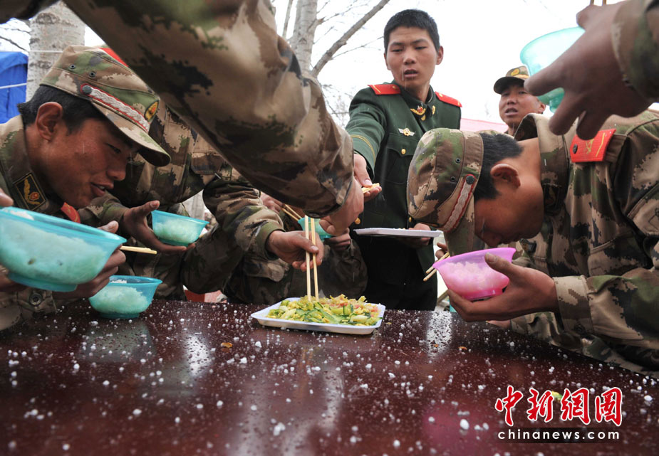 4月20日中午時(shí)分,玉樹(shù)地震災(zāi)區(qū)突然雷雹交加,正在現(xiàn)場(chǎng)救援的青海武警總隊(duì)官兵只能在冰雹中吃午餐。中新社發(fā) 賈國(guó)榮 攝