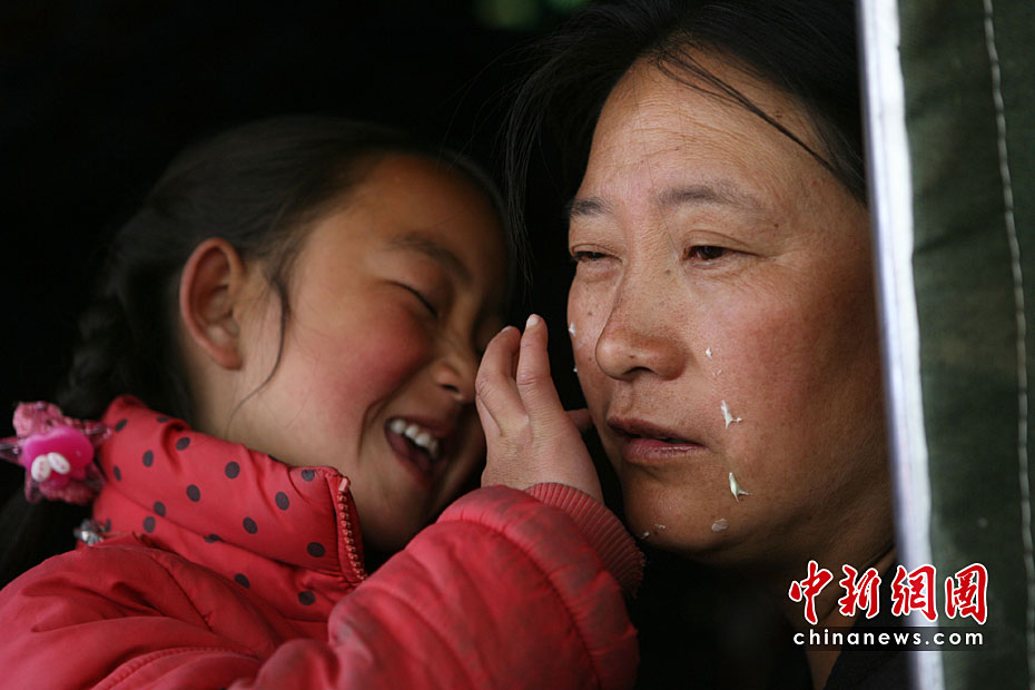 4月20日,青海省玉樹縣結(jié)古鎮(zhèn)紅旗小學(xué)一年級學(xué)生羅菁瑜在臨時(shí)帳篷里為媽媽涂雪花膏。他的爸爸出門到家中倒塌的廢墟里去尋找衣服等可用的物品。中新社發(fā) 蘇丹 攝