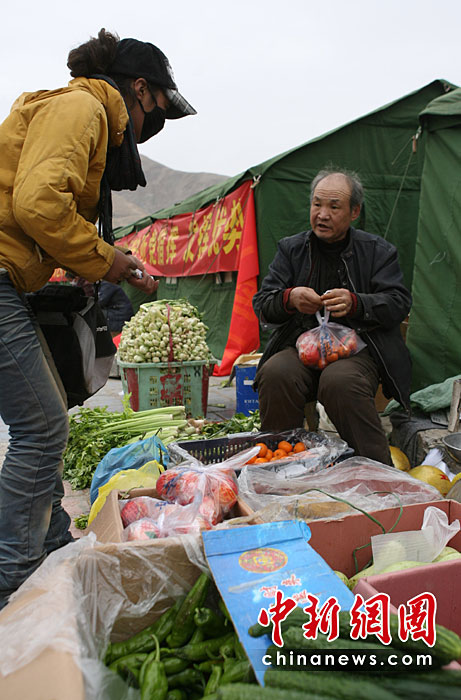4月20日,青海省玉樹(shù)縣結(jié)古鎮(zhèn)一位商販在帳篷區(qū)賣新鮮蔬菜。震后玉樹(shù)逐步恢復(fù)商品供應(yīng)。中新社發(fā) 蘇丹 攝