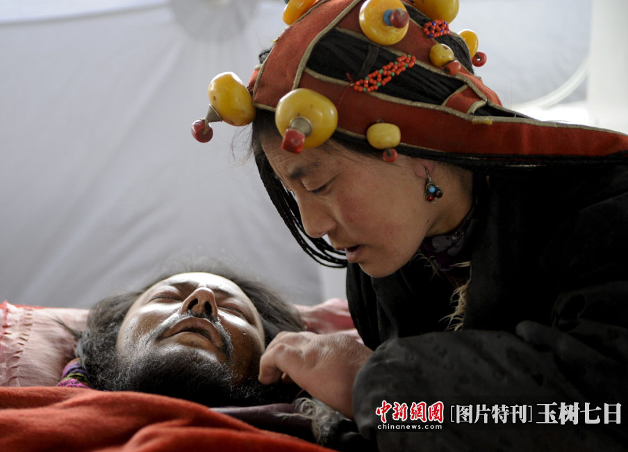 4月16日,青海玉樹體育場武警醫(yī)院醫(yī)療隊(duì)的帳篷里,東周丹增的妻子陪護(hù)丈夫接受治療。東周丹增在地震中肋骨骨折。 中新社發(fā) 廖攀 攝