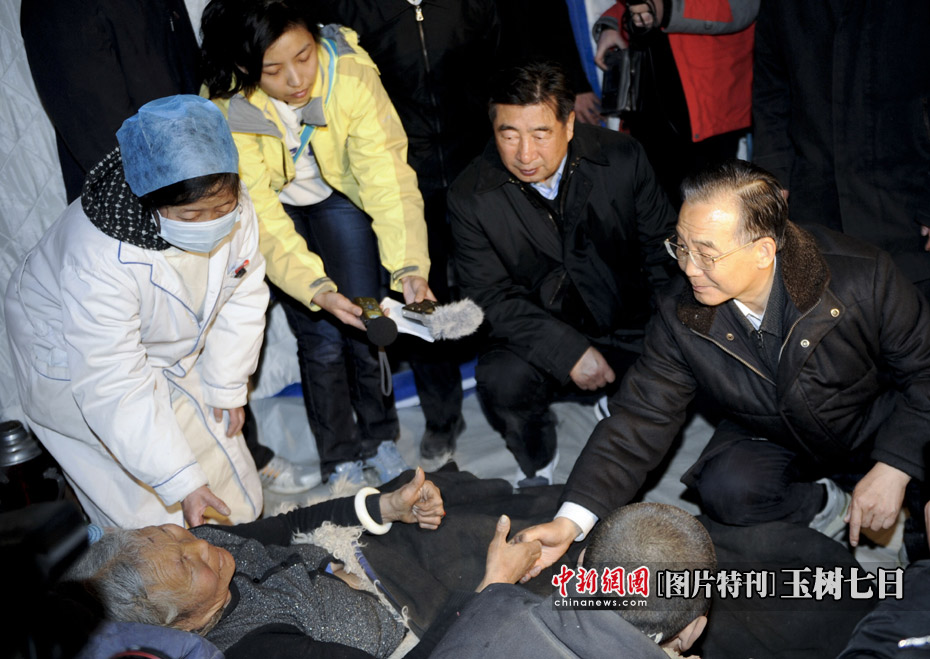 4月15日20時(shí),中國(guó)國(guó)務(wù)院總理溫家寶來(lái)到青海省玉樹(shù)縣玉樹(shù)自治州醫(yī)院看望受災(zāi)民眾。這是溫家寶握著一位藏族大媽的手問(wèn)候其身體情況。國(guó)務(wù)院副總理回良玉、國(guó)務(wù)委員孟建柱參加看望慰問(wèn)。中新社發(fā) 廖攀 攝