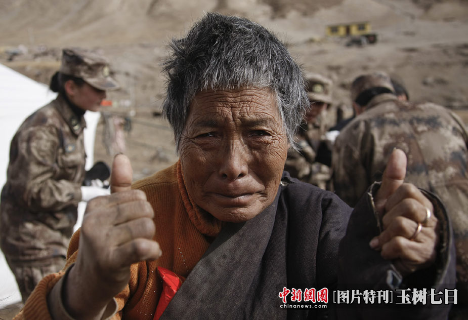 黃林格頭牧區(qū)78歲的旦樣老阿媽熱淚盈眶地向醫(yī)務人員豎起大了拇指。中新社發(fā) 鄒小慶 攝