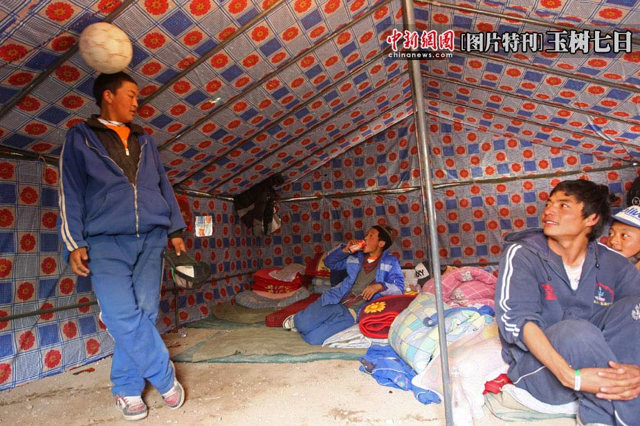 2010年4月19日,青海玉樹(shù)縣結(jié)古鎮(zhèn)玉樹(shù)縣第一民族中學(xué)的學(xué)生宿舍帳篷內(nèi),德尕扎西(左)在其他同學(xué)面前表演球技,稱(chēng)自己是“C羅”。中新社發(fā) 盛佳鵬 攝