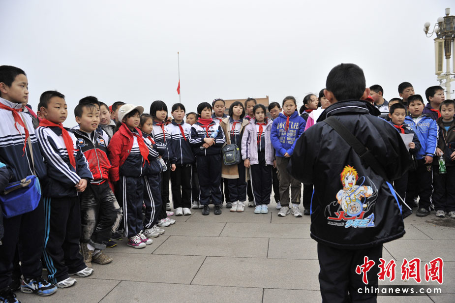 4月21日清晨,廊坊第十二小學的小學生來到天安門廣場朗讀自己的作文悼念青海玉樹地震的遇難同胞。中新網(wǎng)記者 金碩 攝