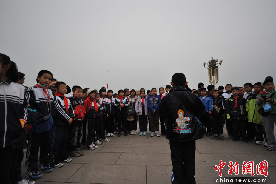 4月21日清晨,廊坊第十二小學(xué)的小學(xué)生來(lái)到天安門廣場(chǎng)朗讀自己的作文悼念青海玉樹(shù)地震的遇難同胞。中新網(wǎng)記者 金碩 攝