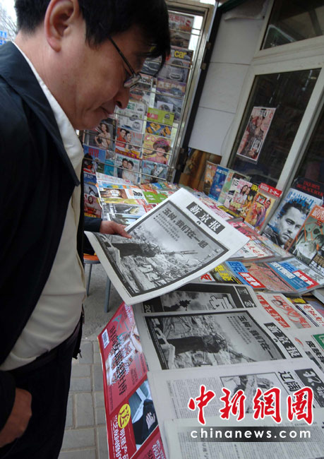 4月21日,按照中國國務院決定,舉行全國哀悼活動,全國和駐外使領館下半旗志哀,停止公共娛樂活動。當日北京各家報社刊出悼念玉樹地震遇難同胞特刊,并撤銷了一切彩色圖片和字頭,采用黑白版面。中新社發(fā) 鄒憲 攝