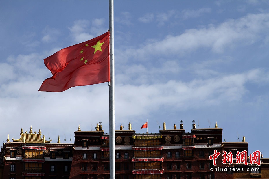 4月21日,西藏布達(dá)拉宮廣場上舉行降半旗儀式。同時,布達(dá)拉宮紅宮頂端的紅旗也降半旗,向青海玉樹地震遇難者志哀。中新社發(fā) 徐長安 攝