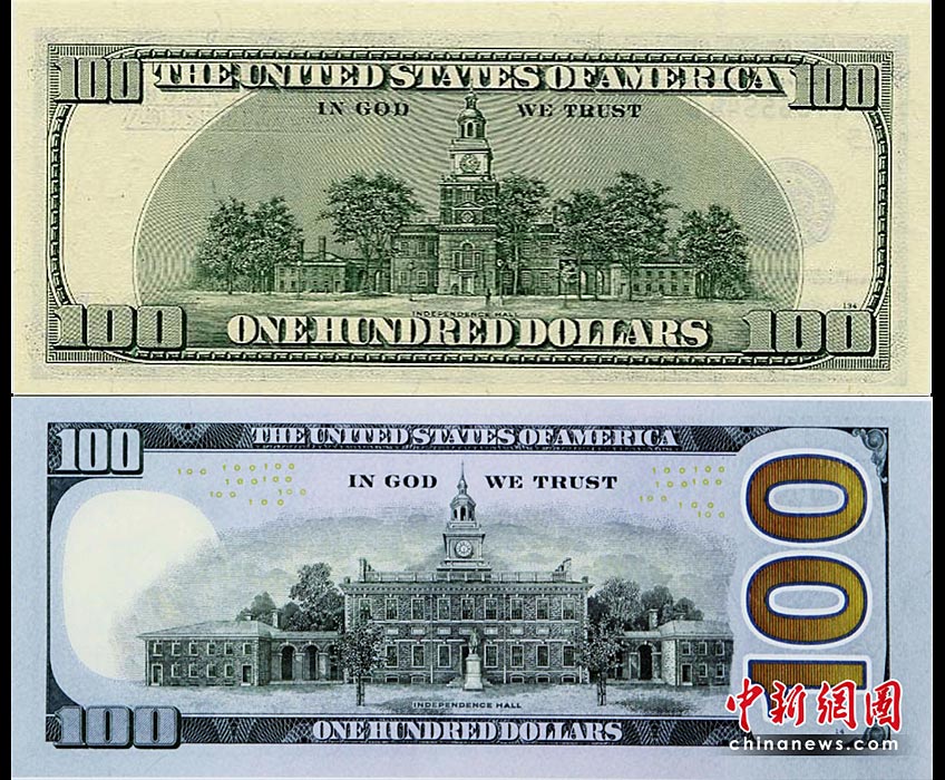 4月21日,美國(guó)財(cái)政部和美聯(lián)儲(chǔ)共同發(fā)布新版100美元面值的紙幣票樣。此次發(fā)行新版百元美鈔旨在防范假鈔,同時(shí),老版美元仍將繼續(xù)流通。圖片來源:中國(guó)新聞網(wǎng)