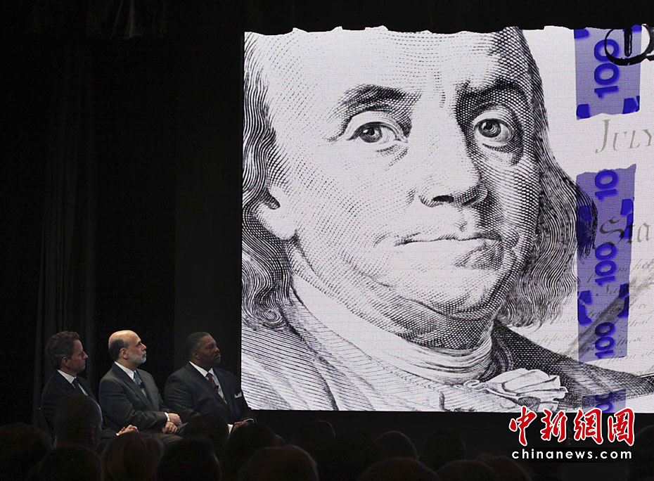 4月21日,美國財政部和美聯(lián)儲共同發(fā)布新版100美元面值的紙幣票樣。此次發(fā)行新版百元美鈔旨在防范假鈔,同時,老版美元仍將繼續(xù)流通。圖片來源:中國新聞網(wǎng)