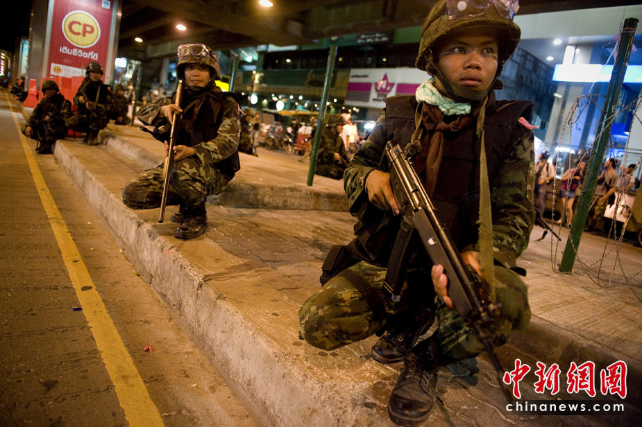 泰國首都曼谷市中心的沙拉登交叉路口天鐵站22日晚接連發(fā)生5起爆炸,造成最少5人死亡,百人受傷,其中10人重傷。圖為泰國警察封鎖了市中心的街道。